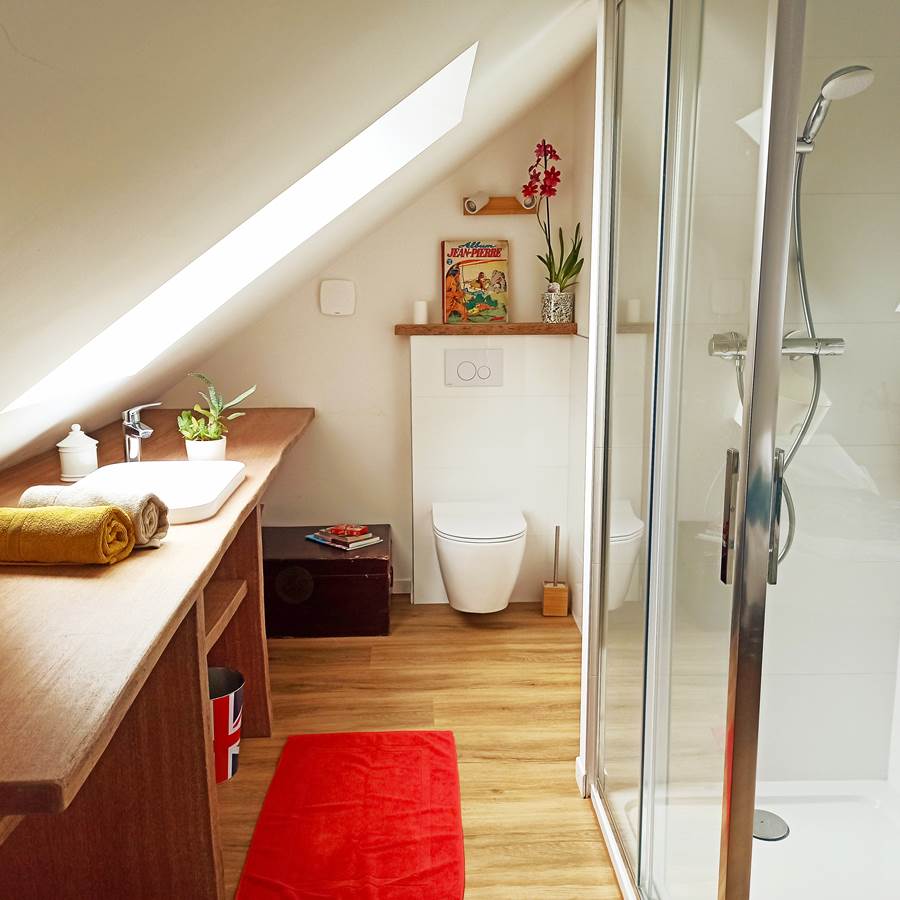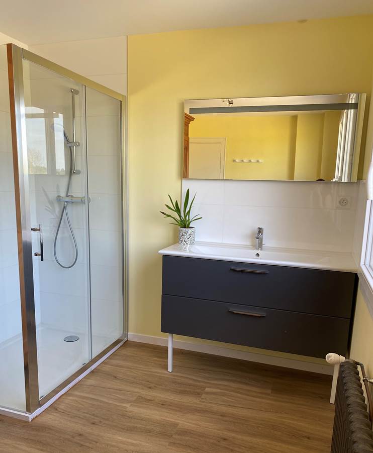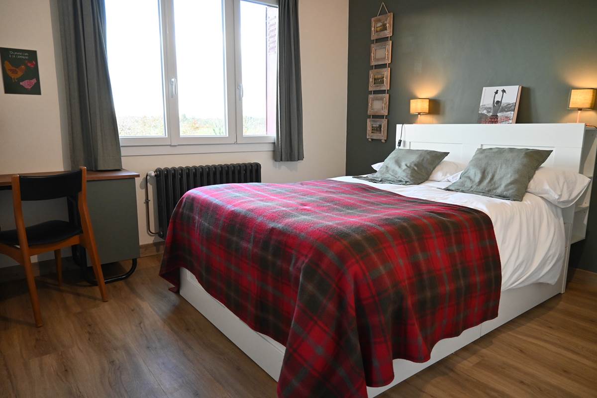 - Une chambre avec un lit double de 140 x 200 avec salle de bain et WC privatifs. Cette chambre est accessible aux personnes en situation de handicap (fauteuil roulant), mais non PMR.
