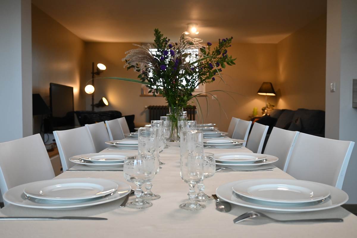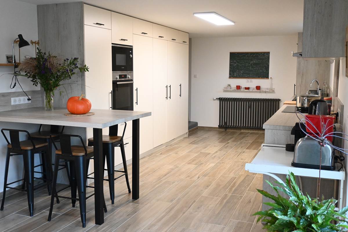 - Une cuisine spacieuse, toute équipée pour 15 personnes donnant sur la terrasse aménagée où vous pourrez prendre vos repas ou vous détendre dans le salon de jardin, mis à disposition et profiter d'une vue imprenable sur le château et le coucher du soleil !